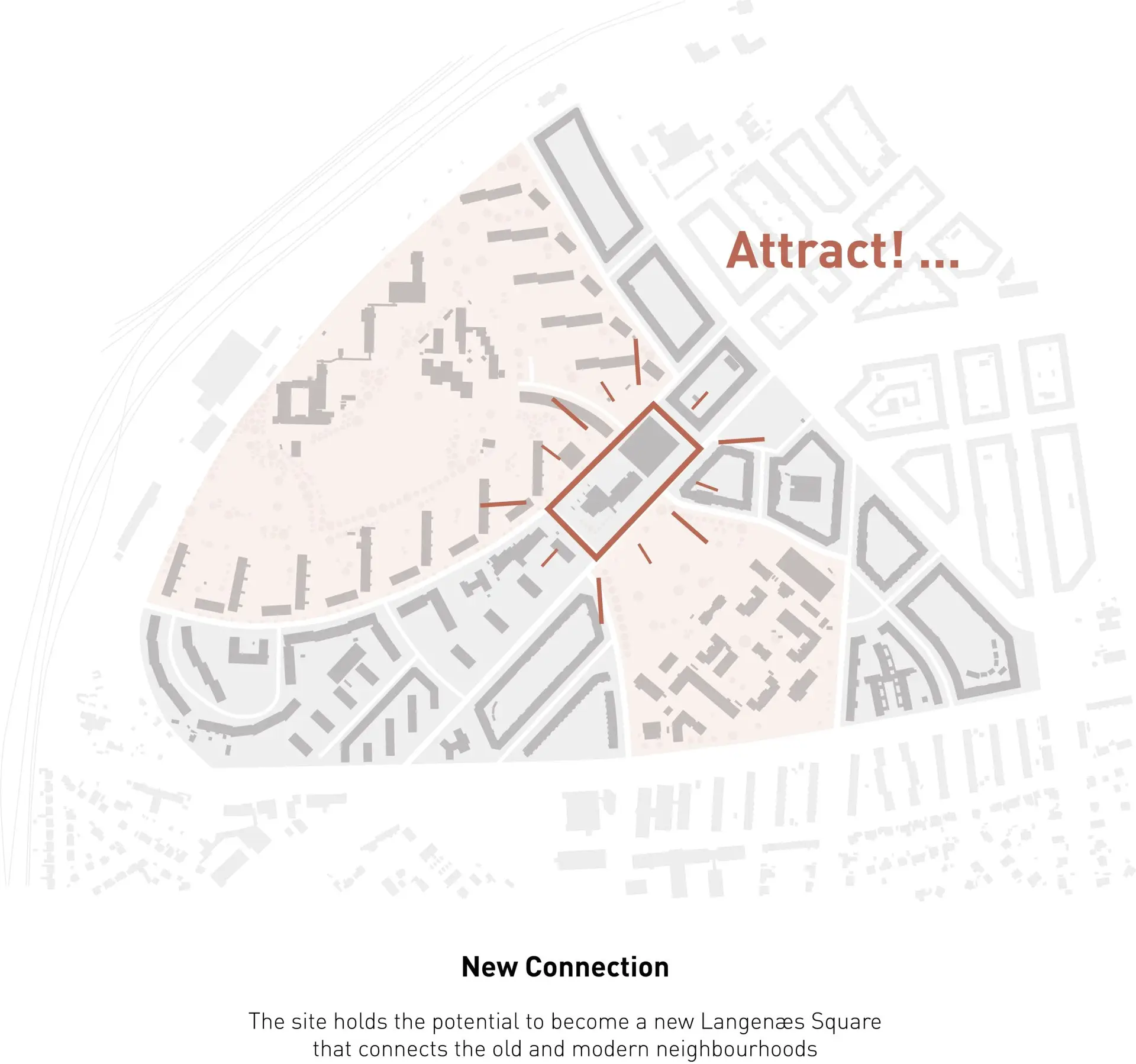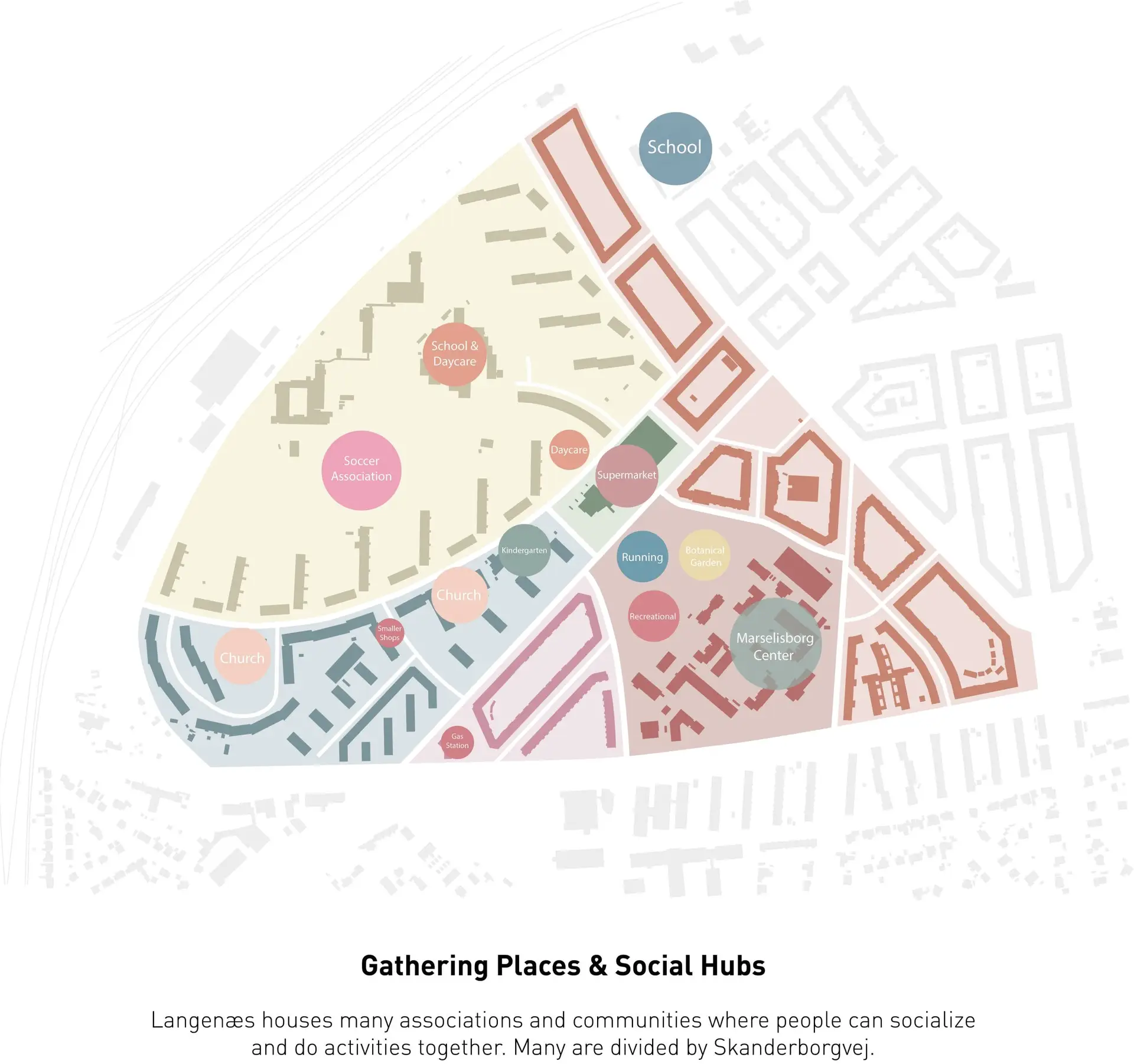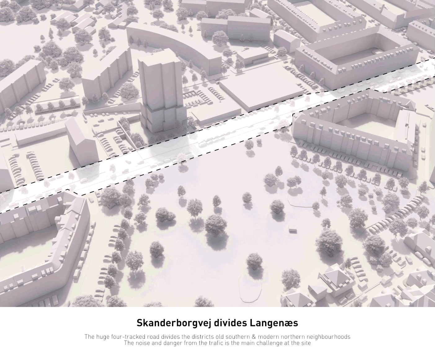 Langenæs opdeles af Skanderborgvej, som både skaber støj og sænker tilgængeligheden. Desuden markeres bydelens midte af et stort privat tårn omgivet af tomme grå parkeringspladser.
