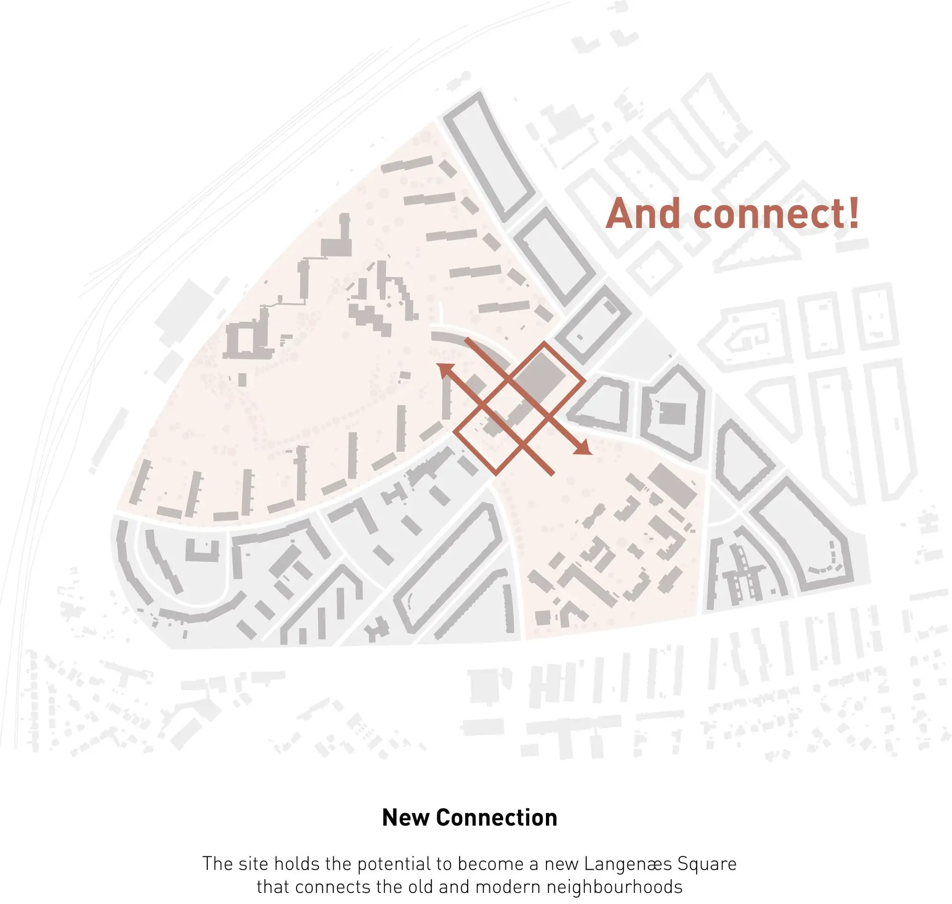 En ny plads skaber et centralt mødested på Langenæs. Fortætning sikrer et behageligt mikroklima og plads til nye tilbud i stueetagen.
