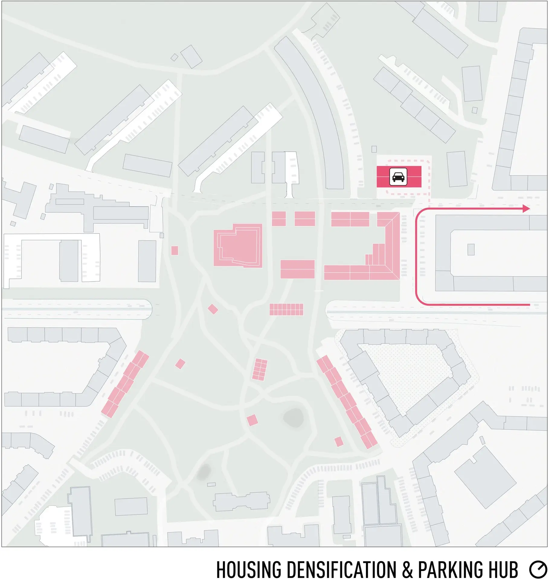 Mobilitetsplanen skaber tryg og sikker trafik i området, hvor farten sænkes og cyklister, gående og offentlig transport prioriteres. Et nyt P-hus frigør de store parkeringsarealer til nye funktioner.