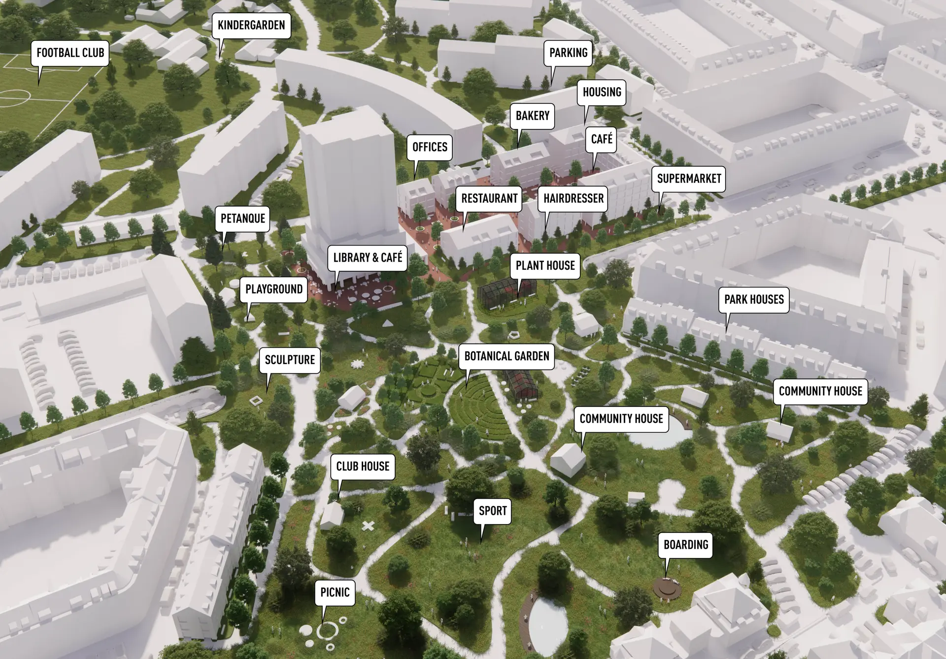 Projektets mange overlejrede lag formidles tydeligt i én samlet bydelsmodel.