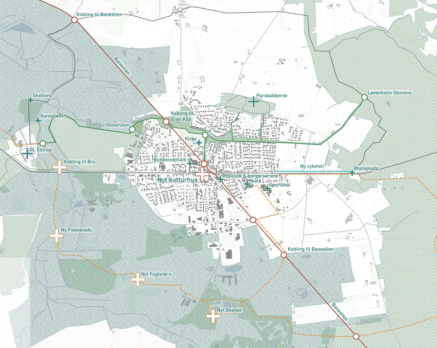 Stedets lokale identitet fremmes gennem dialog med lokale aktører. Vi undersøger de kvaliteter, der allerede kendetegner området, bygger videre på dem og tilfører nye gennem bæredygtige og genanvendte byggematerialer.